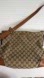 Elegant Gucci shoulder bag with signature monogram design. Features tan canvas and brown leather trim. Adjustable strap for comfort. This bag is used canvas in good condition has , leather has some minor scratches . Width 13.5 inc . height 9.5 inc. depth 4 inc. Strap droop 28 inc. adjustable. Made in Italy . Comes with dust bag.