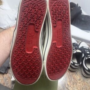 Elegant Gucci slip-ons with signature logo pattern. Tan and cream design. Perfect for casual wear. Worn once immaculate condition