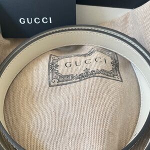 Elegant Gucci belt with tan canvas and gold GG buckle. Perfect for adding luxury to any outfit.