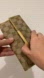 Elegant Gucci clutch with signature monogram. Features tan and gold accents.