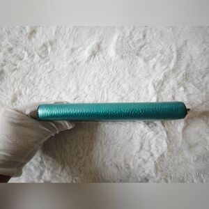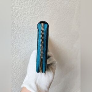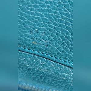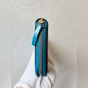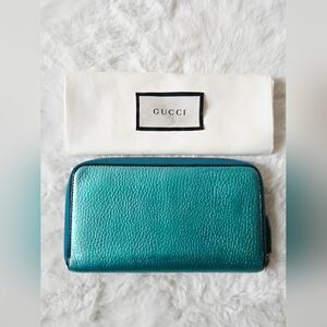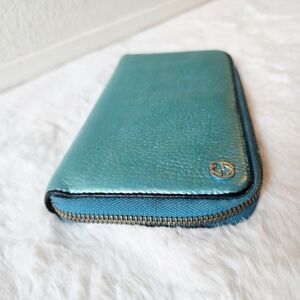 Elegant Gucci wallet in teal leather. Features zip-around closure. Iconic Gucci logo detail.