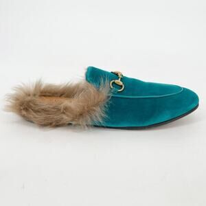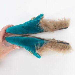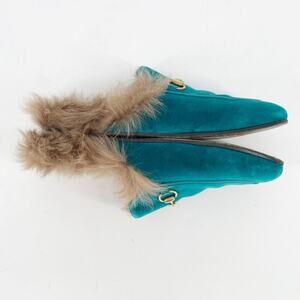 Gucci Teal Velvet Fur Lined Princetown Horsebit Mule Slipper Flat Loafer EU 37