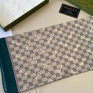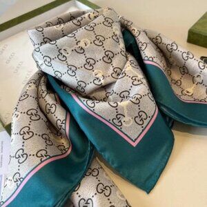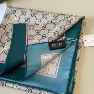 Elegant Gucci silk scarf. Features iconic pattern. Teal and cream colors. Luxurious accessory.