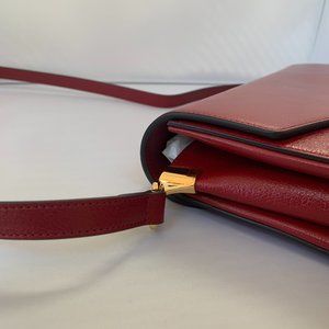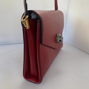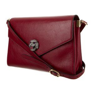 features a crystal-embellished feline head at front flap, a flat, adjustable shoulder strap, and a nylon, sky blue interior with 1 zip pocket and 1 slip pocket.