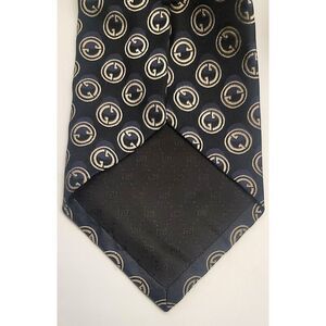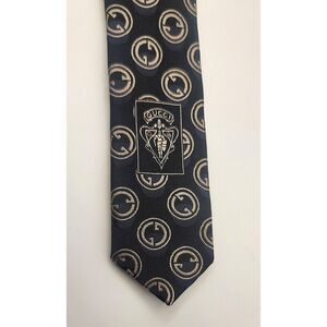 Very nice Gucci tie. Dark navy blue with enclosed, interlocking gold Gs. Really sharp Gucci signature tie. Tie is in perfect condition.