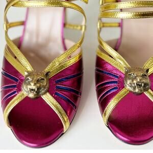 Gucci Tiger Head Metallic Leather Ankle Strappy Sandals Pink Gold Size 8.5 NWB. The perfect pair of party shoes - these Gucci Multicolor Metallic Sandals will make you shine all night long! Strappy crisscross design. Ankle strap with an adjustable buckle. Peep toe. Stiletto heel. Made in Italy. Nappa Silk.