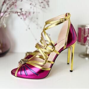 Gucci Tiger Head Metallic Pink Gold Leather Strappy Heels 8.5 NWB Made in Italy