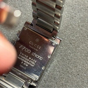 Gucci Timepieces 7700 Chrono Swiss Made Stainless Steel Men’s Watch Working comes with 1 extra link watch shows signs of wear such as light scratches on case and band see pictures for reference watch only
