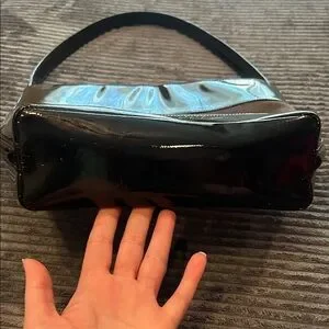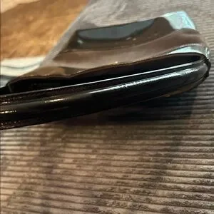 Stylish brown shoulder bag with patent and suede panels. Features a sleek silhouette and single shoulder strap for easy wear. Neutral brown complements many outfits.