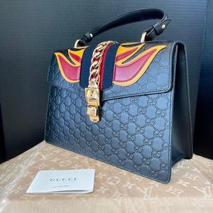 Very Rare Sold Out Limited Edition Gucci Top Handle Sylvie 1969 Flame Edition. Black Leather Embossed with 'GG' Motif. Striped Canvas Webbing with Sophisticated Gold Chain and Buckle Accenting. Features Limited Edition Flame Appliques. Detachable Leather Strap First Seen on Fall '16 Runway. Made In Italy.