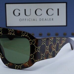 Stylish Gucci sunglasses. Tortoise shell frame. Green tinted lenses. Iconic Gucci pattern.