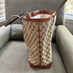 This authentic Gucci Tote with golden horse shoe emblem is in superior condition. Slightly worn leather handles give it the vintage look but everywhere else is like new! Interior pocket w/ original tags, leather bag perfect for traveling - fits laptop, wallet, book, cosmetic bag and pashmina! Perfect travel buddy.