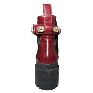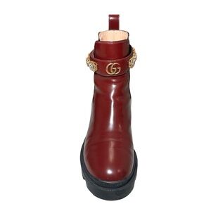 Gucci Trip Bootie with Jewels in Bordeaux. Featuring a bold lug sole, iconic gold GG logo hardware, and crystal-embellished straps, these boots make a statement while providing comfort and durability. Overall great condition with a few scuff marks as shown in photos.