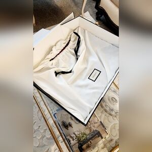 This stylish tote bag features a striking red and black design, chain handles, tweed material, and perfect for any occasion. The elegant pattern and gold chain accents add a touch of luxury to your ensemble. I have hardly carried it. It comes with a clutch, dust bag, and original box. It measurements about 17 inches long, and 13 inches high. Please ask if you have any questions.
