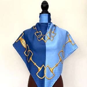 Authentic Gucci Iconic Equestrian Horsebit Chain Logo Print Blue Silk Scarf