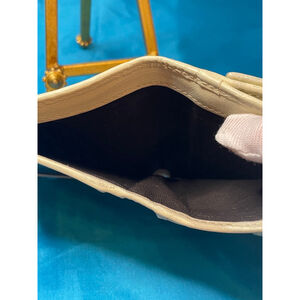 This pre-owned Gucci wallet is made of off-white leather with an embossed GG pattern. It features a heart-shaped metal logo on the front flap, which secures with a snap closure. Inside, the wallet has multiple card slots, a clear ID window, and a bill compartment. The wallet measures approximately 4.5 inches in width and 3.5 inches in height. There are minor scuffs and signs of wear visible on the exterior leather and the metal hardware. The interior shows some discoloration and light marks. The Gucci logo, Gucci serial number and "made in italy" are embossed on the interior.
