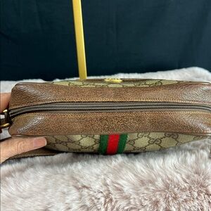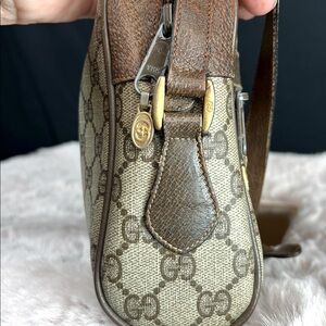 Introducing a stunning vintage Gucci Sherry canvas web and leather shoulder bag from the 1980s. This authentic brown leather purse features the signature GG Supreme pattern and gold-plated hardware accents. The square shape and zip-around closure make it the perfect size for travel, casual outings, or business occasions.