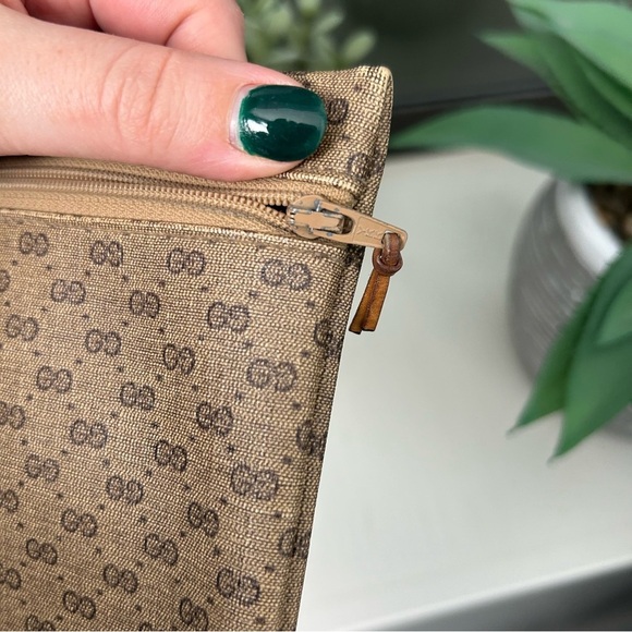 Tan beige vintage clutch with Gucci G pattern throughout. Zipper pouch with plenty of storage inside. Certified authentic. Some wear on corners shown. Tons of love left. Good condition!