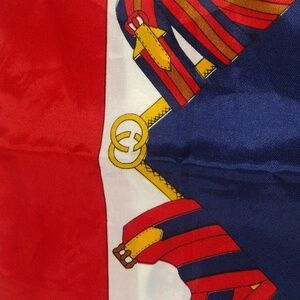 This vintage Gucci silk scarf features a striking red dressage equestrian horseback rider motif, celebrating classic elegance with its intricate design. Measuring 33.5x34 inches, this luxurious silk accessory brings a touch of timeless sophistication to any wardrobe, perfect for horse lovers and vintage fashion enthusiasts alike.