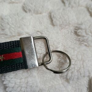 Stylish Gucci keychain featuring a black base with iconic red and green stripe. Perfect accessory for keys o charm.
