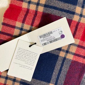 Rectangular wool and cashmere-blend scarf featuring check pattern in navy, red, and beige.