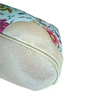 This tote bag features a floral canvas body with leather trim , flat leather straps , open top with magnetic closure and interior zip and slip pockets handless very worn, corners color redone because of rubbing color fading and scratches inside clean beautiful vintage bag.