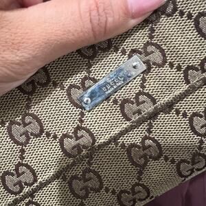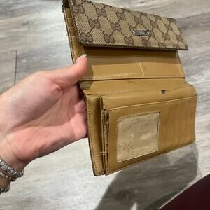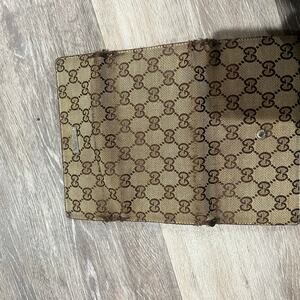This is a Gucci vintage monogram brown long wallet. It has been pre-owned and is well-loved, showing signs of wear throughout. Please carefully review the photos for a detailed look at the flaws. Despite its imperfections, this wallet is still functional and could be restored if desired. It's a great opportunity to own a piece of Gucci history! Don't miss out! About 7 by 4 inches