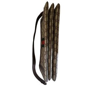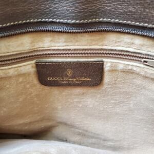 canvas gucci logo. Leather strap and trim. Twill stripe trim. Original strap was shortened from a crossbody. Purchased nearly 20 years ago. Most likely from the 70's or 80's. Very spacious features accordian bottom.