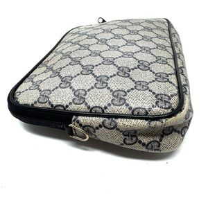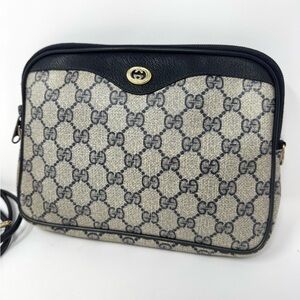 Authentic vintage Gucci Ophidia crossbody bag in rare navy GG Supreme canvas with leather trim and gold-tone hardware. Classic silhouette with the iconic front web stripe and double G logo.