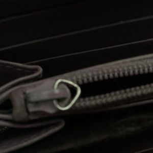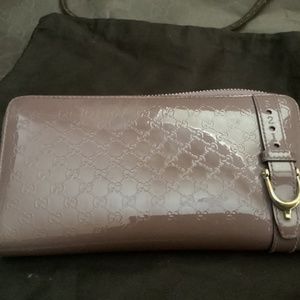 Mauve light color Gucci wallet in Good used condition with flaws missing zip pul on inside of wallet, tarnishing or hardware and unraveling on bill slot on inside cane be fixed with sealer. The defects doesn’t affect function or use. Please see pictures.