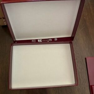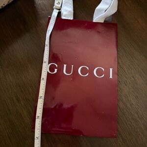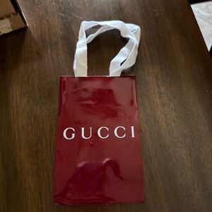 Glossy deep red Gucci box with prominent white logo. Clean, luxe presentation. Ideal for giftin, display or Storage