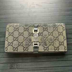 Sleek and sophisticated, this authentic Gucci long wallet features the iconic GG canvas in navy with smooth leather trim. The round zip closure opens to a spacious interior, perfect for organizing your daily essentials in signature Gucci style.