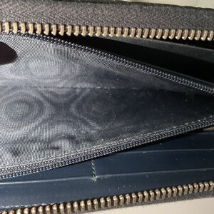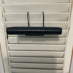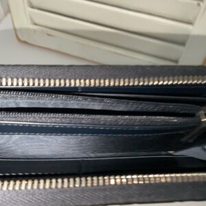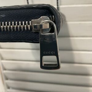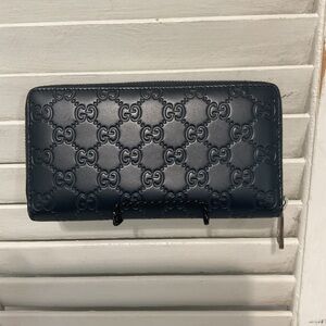Elegant Gucci wallet in navy leather. Features embossed logo pattern. Sleek and sophisticated design.