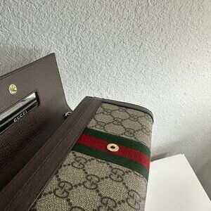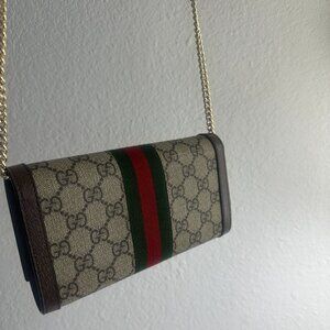 You absolutely have to check out this Gucci Ophidia wallet it’s seriously a personal favorite! It’s in perfect condition, truly looking brand new, with that gorgeous brown leather and the cool gold chain detail that makes the whole look pop. The best part? The inside is spotless zero marks, super clean interior. Plus, don't let its chic size fool you; this beauty fits way more than you'd expect, so you can ditch the bulk without sacrificing style. Grab this iconic piece before someone else snatches up this pristine favorite!