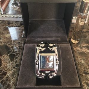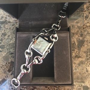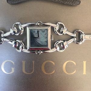 Tell time with elegance!!!!! Authentic Gucci Quartz Water resistant watch In Stainless steel with blue/gray mother of pearl dial. This timepiece would be gorgeous and fashionable addition to your wardrobe! Very good condition!!!!