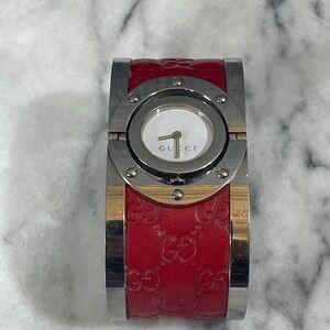 Gucci Watch Bracelet Red Leather Stainless Steel Twirl Clasp Retro Monogram