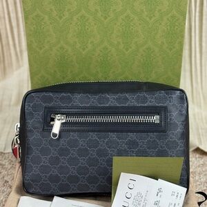 Stylish Gucci toiletry bag with iconic monogram. Features sleek black and gray design. Ideal for travel or daily use bag in good condition used twice including everything on pictures.