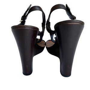 Gorgeous vintage Gucci high-heeled wedge sandals featuring iconic interlocking G leather uppers and timeless Italian craftsmanship. The rich leather forms the classic Gucci logo cutouts, and the elegant wedge heel adds comfort and style. These are in preloved condition with minor signs of wear: some cracking on the leather Gs and a few scuffs on the heel—not noticeable when worn. Overall, they remain a beautiful statement pair for any designer shoe lover or vintage fashion fan.