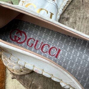 Elegant Gucci espadrilles in white. Features gold logo with green and red stripes.