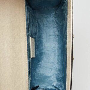 The exterior leather has rubbing and soiling to the base and edges. The gold print has some fading and wear. The hardware is bright and crisp but there are scratches and scuffs present to the lock. The interior lining has creasing and rubbing.