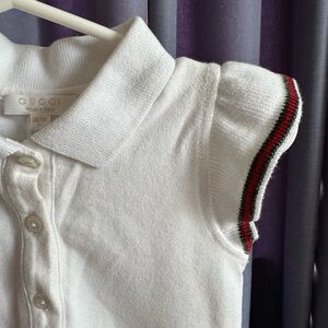 Gucci white polo onesie with signature red and green striped sleeves. Ideal for stylish baby girl or boy! Worn a couple of times but still looking brand new!