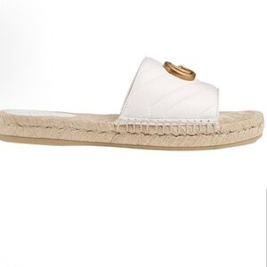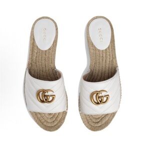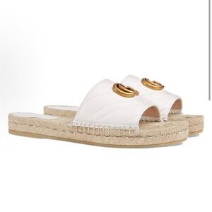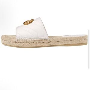 Elegant Gucci sandals with white leather straps. Gold logo detail. Comfortable woven sole. These Gucci sandals feature a sleek white leather strap adorned with the iconic gold-tone double G logo, offering a touch of luxury. The natural beige jute midsole complements the minimalist design, while the open-toe silhouette ensures a comfortable fit for warm weather. Like new, worn once inside. Stock#30.2