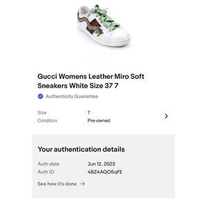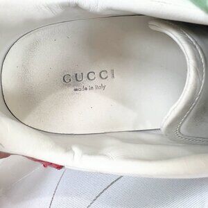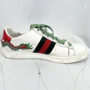 Stylish Gucci sneakers. White leather with green laces. Features dragon embroidery in red, green, and gold.
