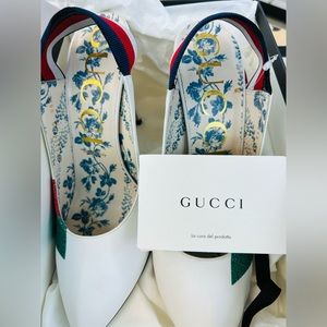 Gucci White Sylvie Slingback Heels Red Green Glitter