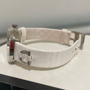 Chic Gucci watch with white textured lizard leather strap. Features a minimalist round face.
