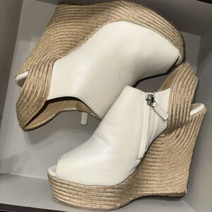 Elegant white wedge heels. Features a stylish peep-toe design. Perfect for any occasion.