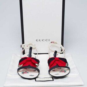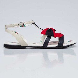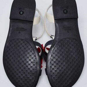 Look comfortable and stylish with these fashionable from Gucci! Featuring white and navy blue leather, the open toe sandal has the iconic red and blue web striped bow on top, these work perfect with jeans! You'll love the effortlessly cool look.
