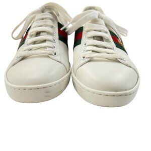 These Gucci Ace Sneakers feature a sleek white leather design with the iconic green and red web stripe. Crafted in Italy, they showcase a luxurious blend of style and quality. Ideal for elevating casual looks, these sneakers embody Gucci’s commitment to timeless fashion and superior craftsmanship.