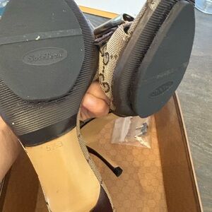 Elegant Gucci mules with signature monogram pattern. Features a stylish buckle