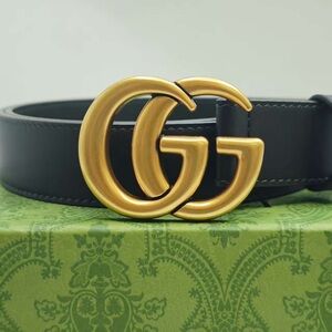 Minimal black leather strap featuring a standout gold GG buckle. No fraying, holes are firm, and buckle finish is smooth.Leather feels sturdy, edges are even, and buckle adds a bold statement look.